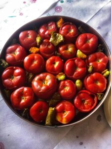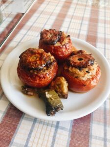 Tuż pod dachem tarasu tawerny jaskółki uwiły gniazdko, zajęte są bardzo, co raz to wlatują i wylatują ze swojego obejścia, w ogóle nie zwracając na nas uwagi. A my napełniamy pomidorki ryżowo – miętowym nadzieniem, byle nie po brzegi, bo ryż napęcznieje w piecu i wypełni całą pomidorową przestrzeń. Wtapiamy się powoli w niespieszny rytm życia wioskowego kafenionu, racząc się opowieściami o kreteńskiej kuchni i winach.