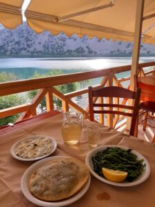 Po Argiroupoli udaliśmy się nad wodę – tym razem słodką – nad jezioro Kournas. Kąpiele, rower wodny, kajak, pyszny lunch w jednej z miejscowych tawern. Moi Goście odważyli się nawet spróbować kreteńskiego przysmaku – ślimaków w winie z rozmarynem:-)
